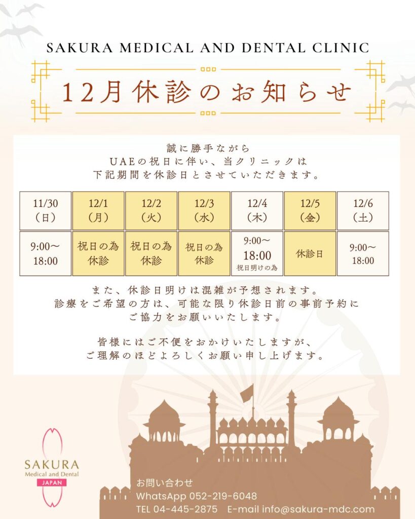 UAEの祝日に伴い、当クリニックは下記の通り休診とさせていただきます。